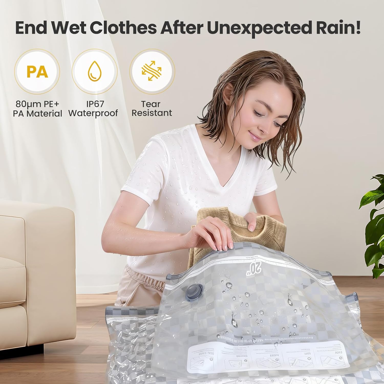 【Extra-Durable, Waterproof PE+PA Material】:Made with 80-micron tear and puncture resistant PE+PA composite—thicker than the industry-standard 65 microns—and rated IP67 waterproof. These space saver vacuum storage bags protect against moisture, dust, and accidental snags, ideal for home storage, moving supplies, and long-term blanket storage.