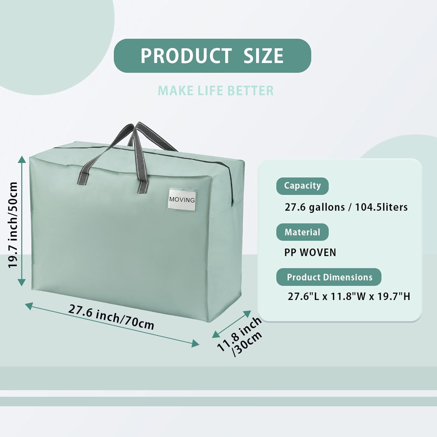LARGE SIZE: 27.6” W X 19.7” H x 11.8” D. 104.5 liters or 27.6 gallons of storage capacity. Spacious enough to fit various items such as clothes, shoes, blankets, bedding, comforters, pillows, towels, Christmas décor, souvenirs, gifts, laundry, camping gear, and more.