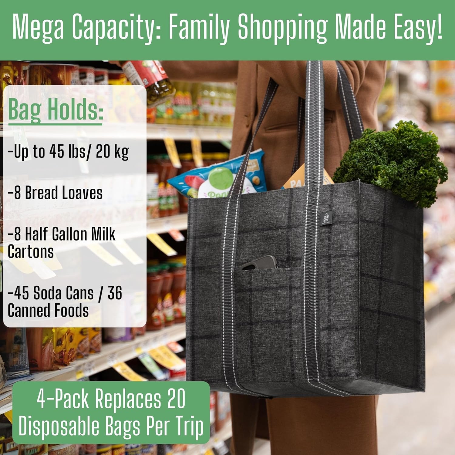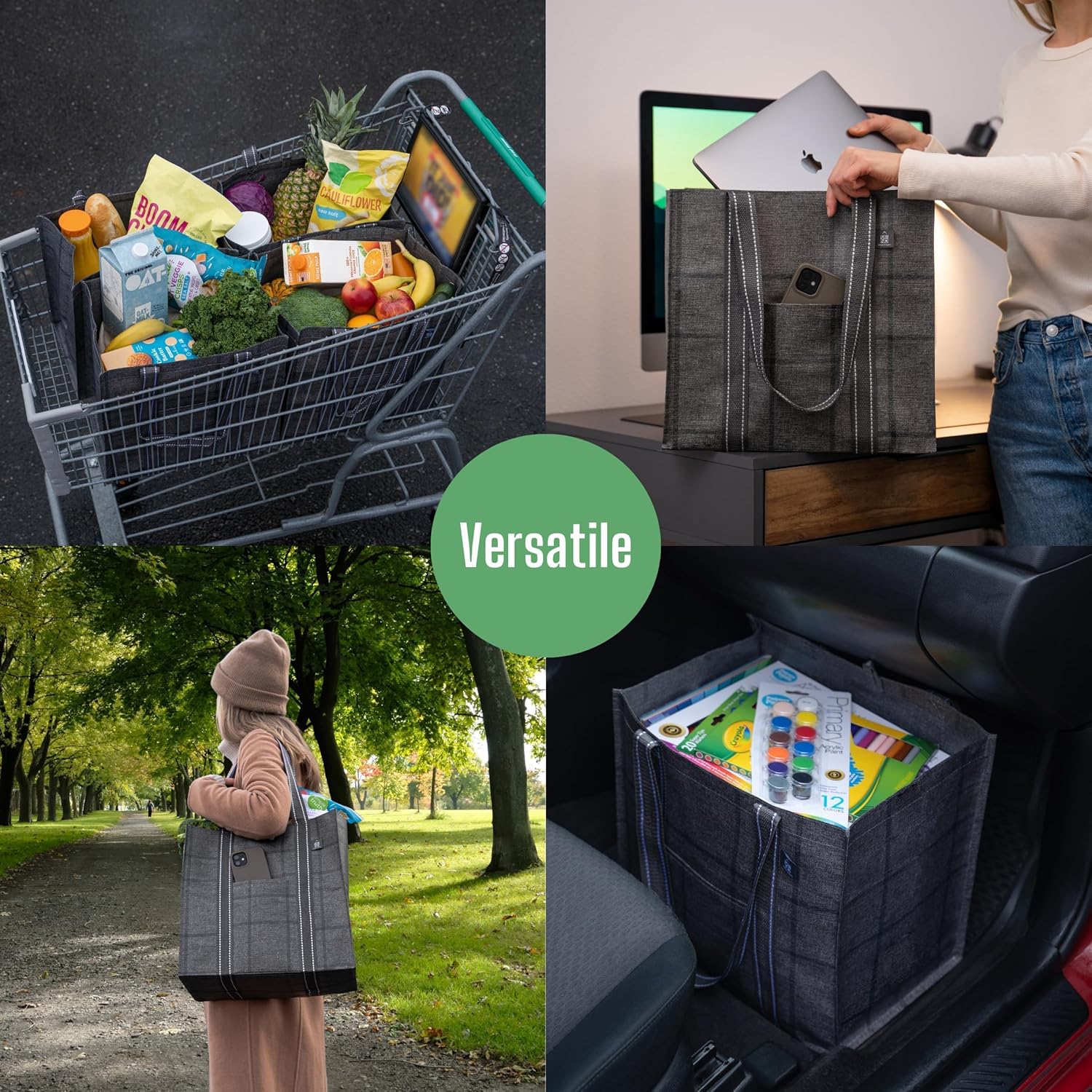 Stays Upright & Easy to Shop w/ Hard Bottom – Keep your items stable and from tipping over when carrying the tote bag or when placed in your car, trunk, shopping cart, counter, or floor with the hard bottom! Easily load and unload with this sturdy bag which stays upright and maintains its shape due to the hard bottom. Place a set of 4 bags in your shopping cart for easy, convenient, and organized shopping!