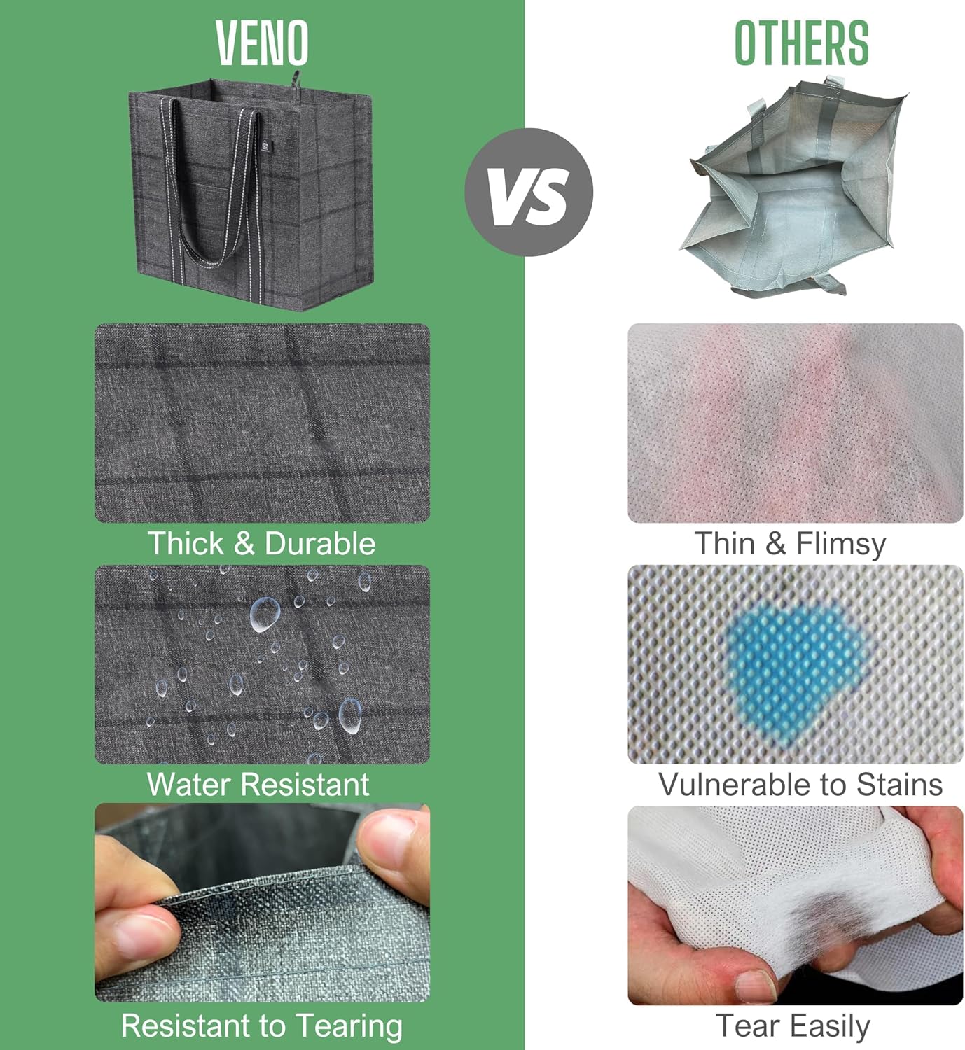 Reusable & Sustainable to Protect the Environment – VENO reusable grocery shopping bags are created through maximizing the use of post-consumer material to make high-grade bags that save plastic from ending up in oceans, lakes, and landfills. Help us in protecting our environment to create a cleaner, more livable future. Collapsible and foldable for future use and easy storage in your car, glove compartment, kitchen, cabinet, drawer, luggage, or purse!