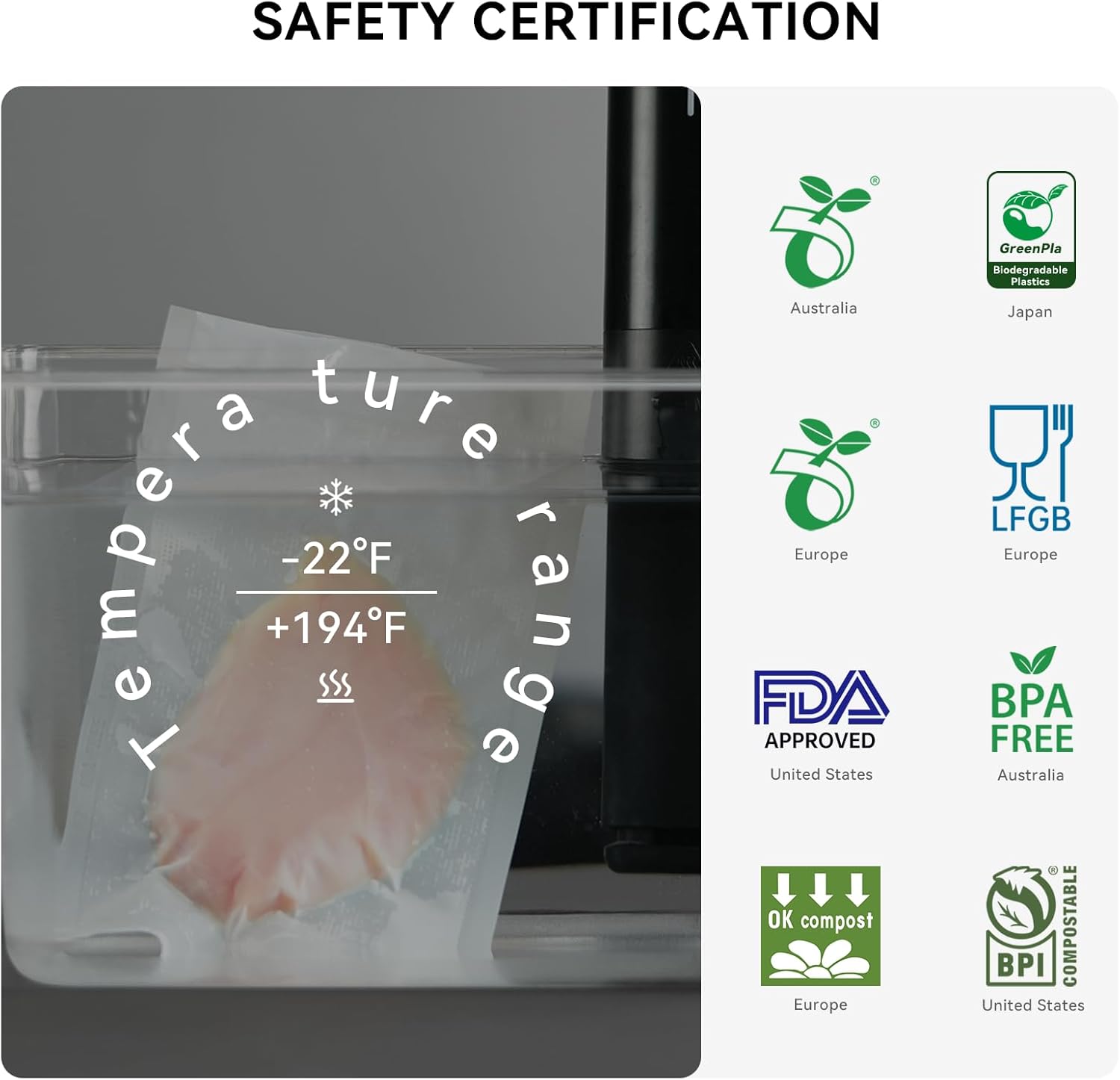 【Same Professional Seal, Lighter Footprint】 – These vacuum seal bags provide the same durable, airtight seal as traditional plastic bags but with a reduced environmental impact. BPA-free and certified safe for direct food contact, they lock in freshness and flavor while helping your household minimize single-use plastic waste.