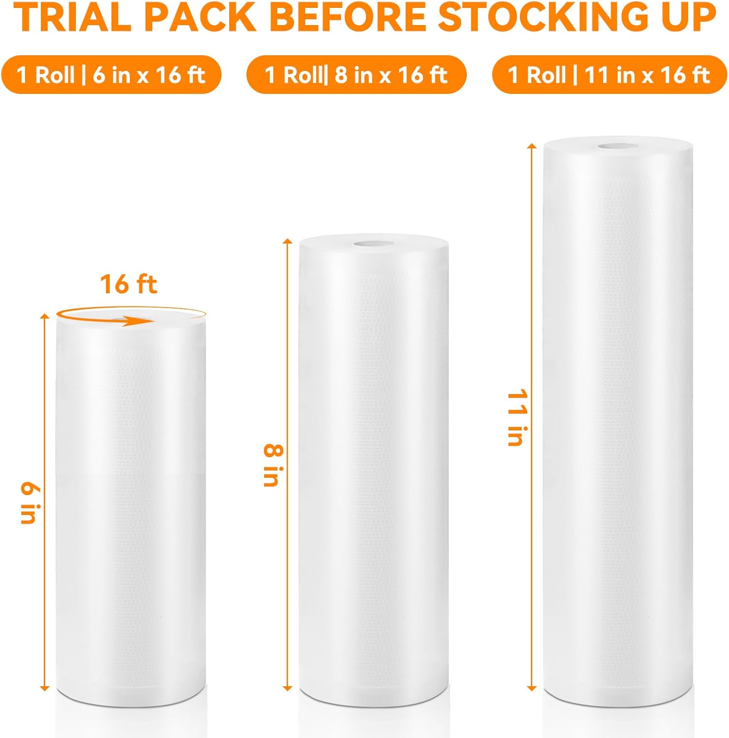 3-Roll Variety Trial Pack – Includes three popular sizes: 6″x16′, 8″x16′, and 11″x16′, perfect for first-time users who want to try Wevac quality without buying in bulk.