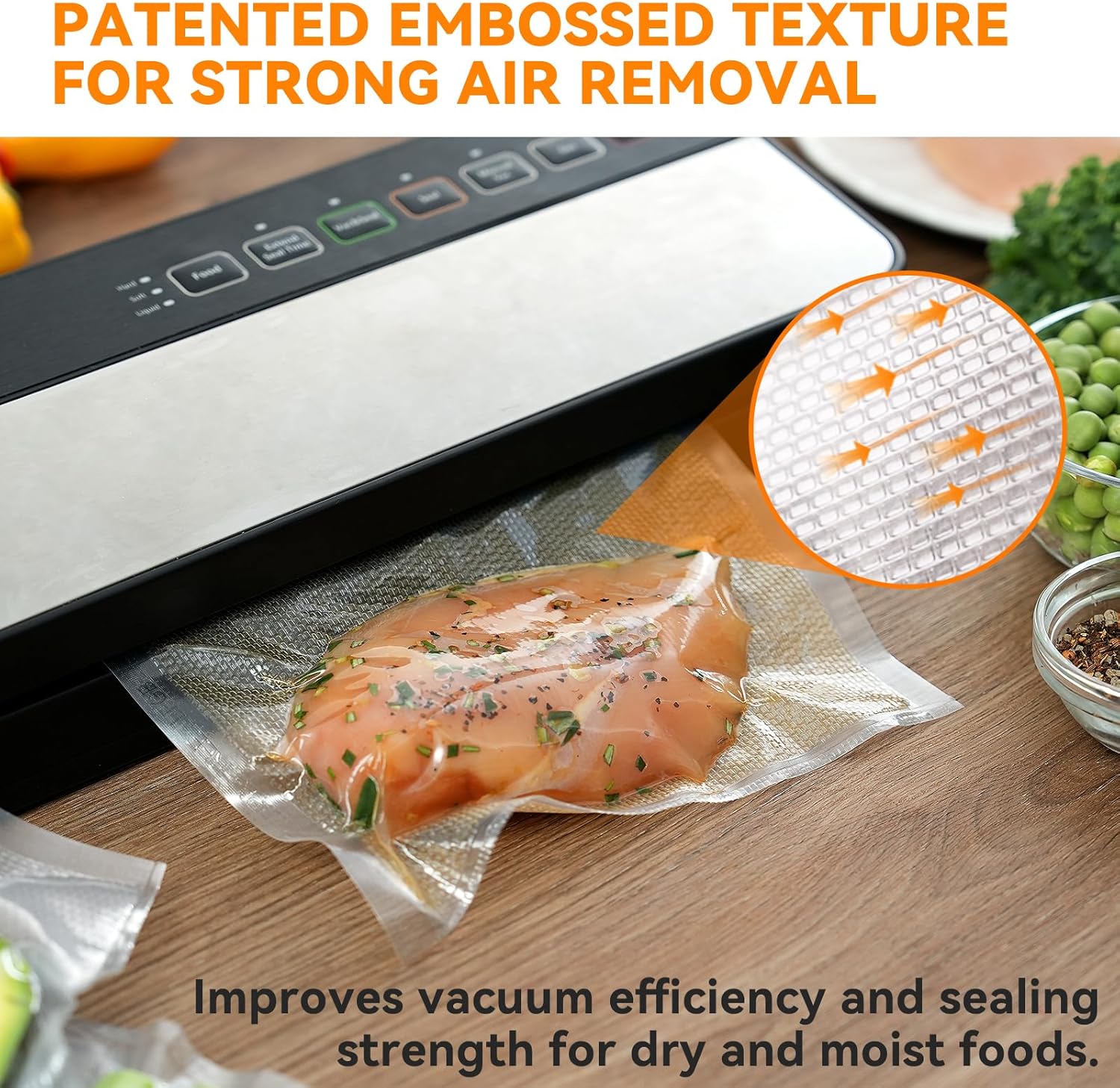 Embossed Texture for Strong Vacuum Seal – The special pattern ensures maximum air removal for airtight sealing, ideal for both dry and moist foods.