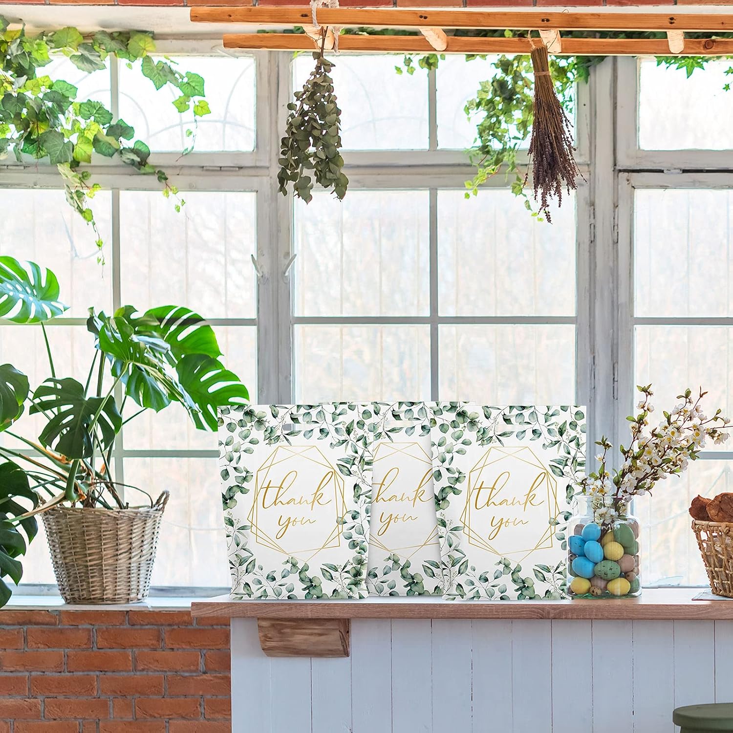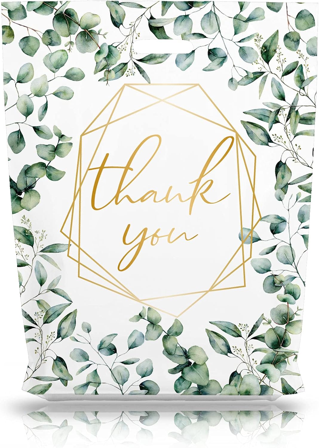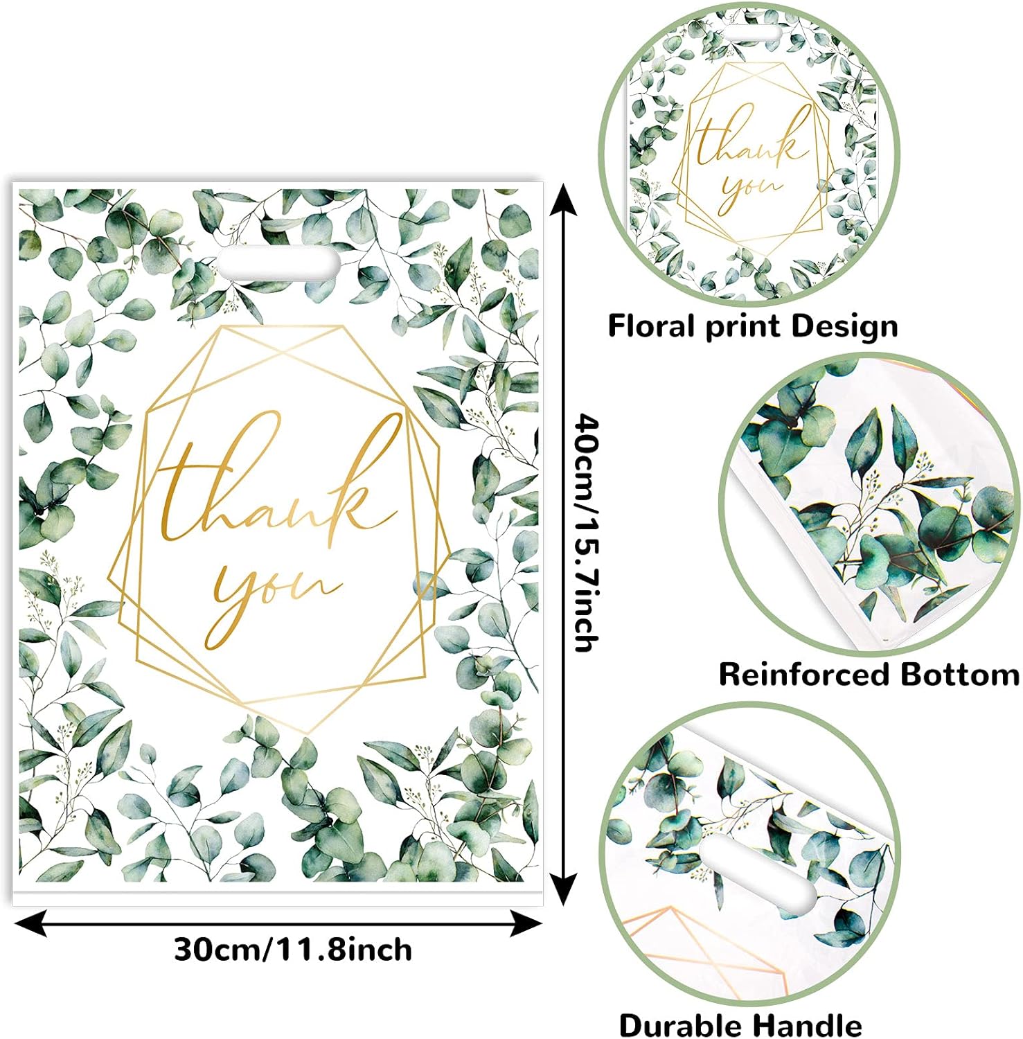 Whaline Thank You Merchandise Bag with Die Cut Handle Plastic Greenery Leaves Theme Boutique Bags 12 x 16 Inch Bulk Thank You Gift Bags for Wedding Birthday Baby Shower Party Shopping Retail 50 Pack