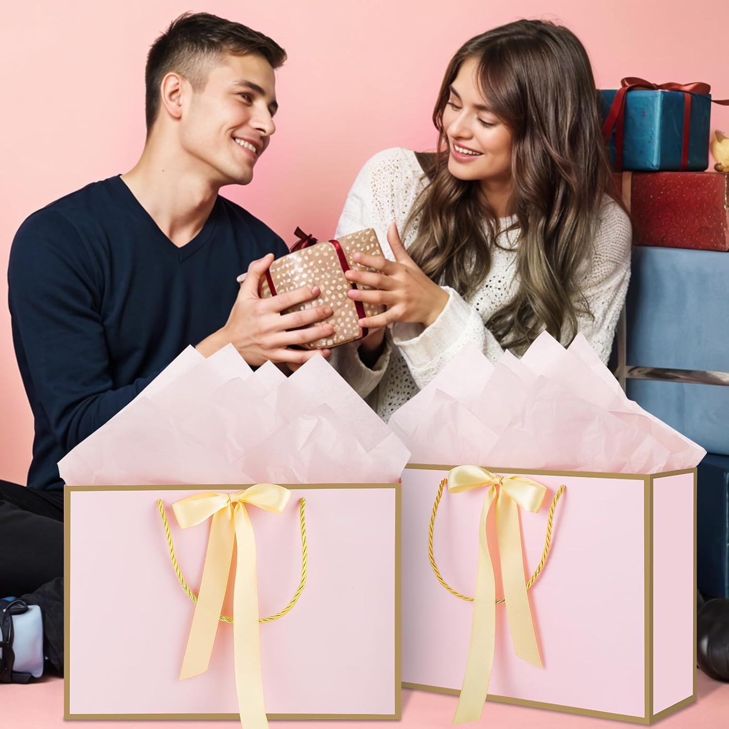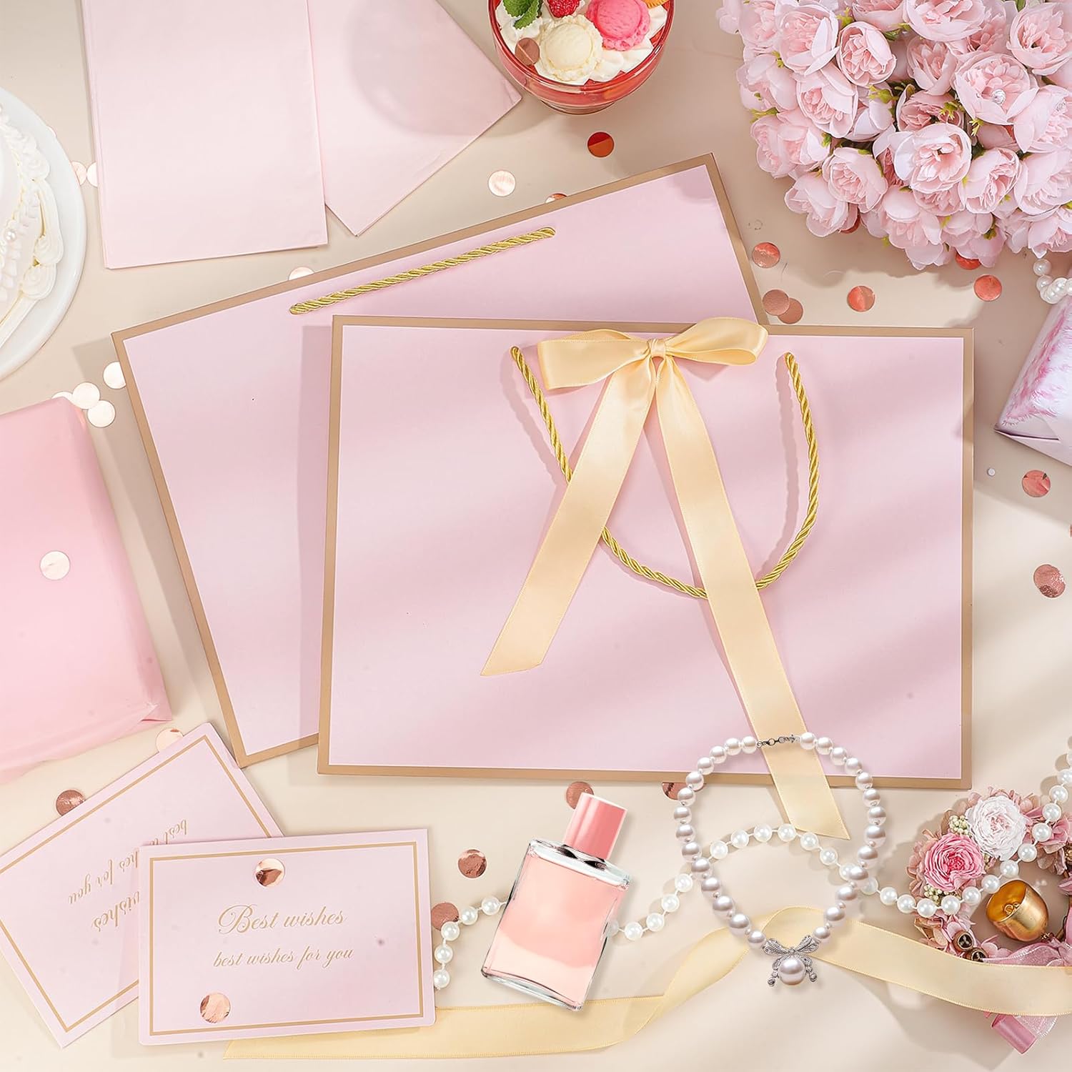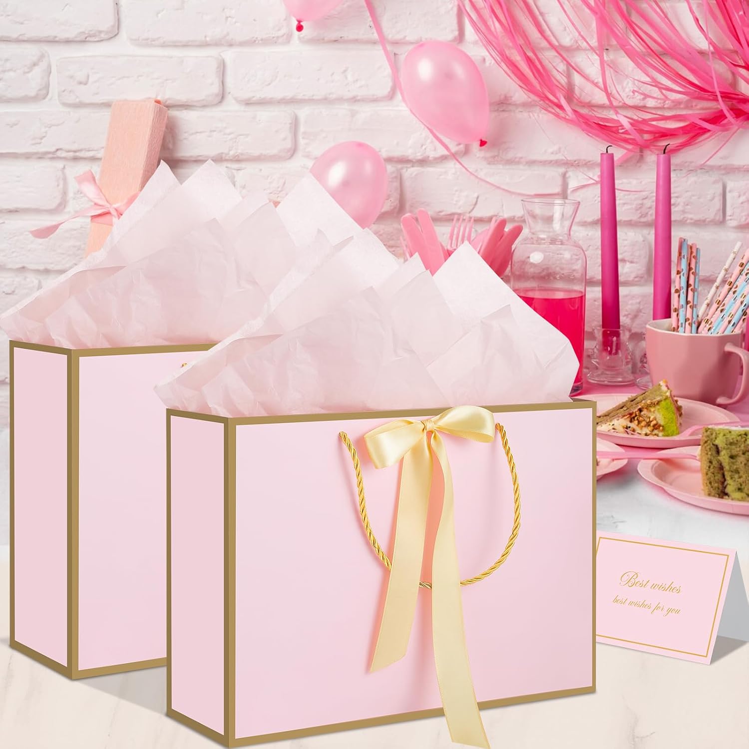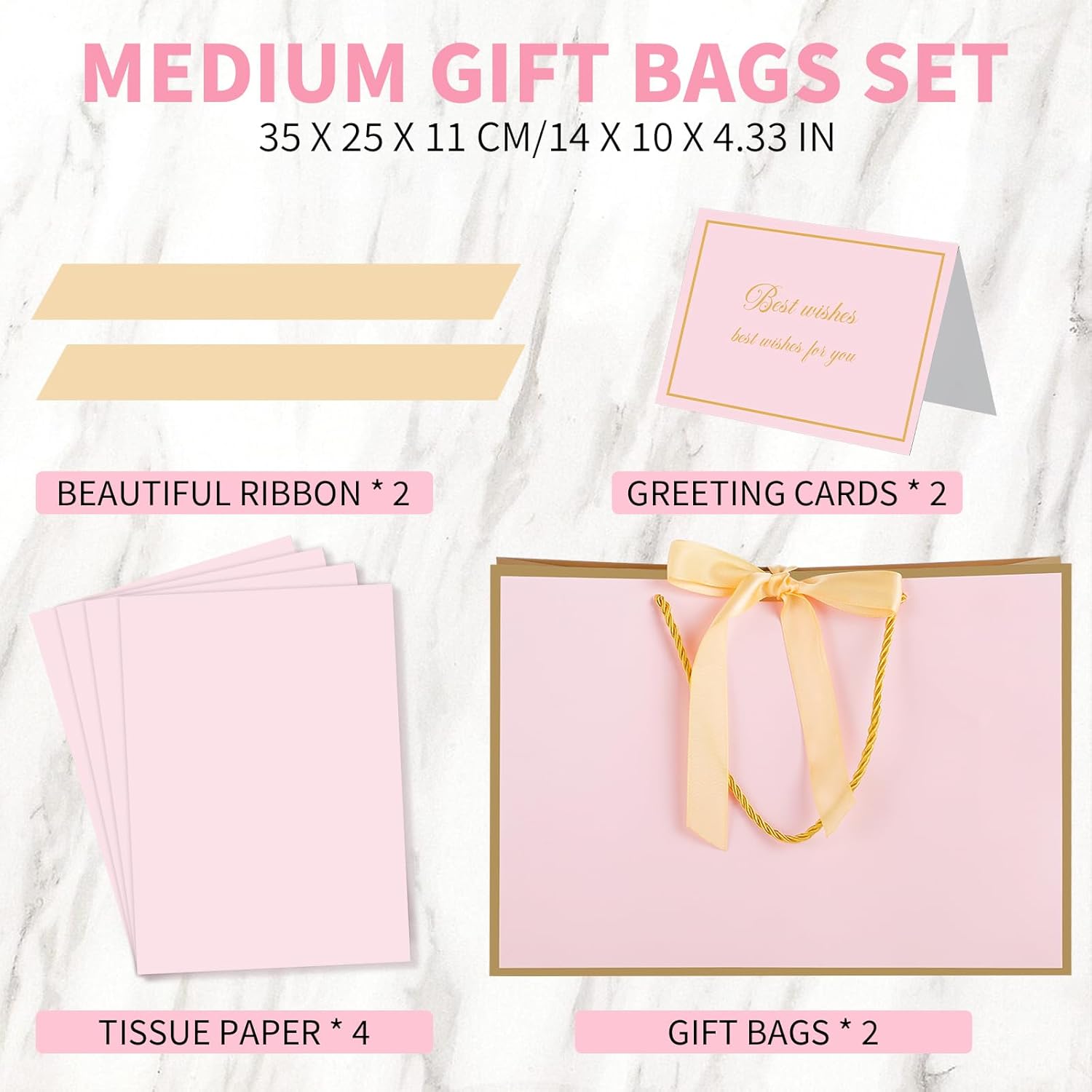 ❤【Gift Bags Sets】You will get 2 pink gift bags with handles, 4 sheets of tissue paper and 2 greeting cards. Each gift bag is paired with 2 sheets of tissue paper and 1 greeting card, which is enough to decorate your gifts.