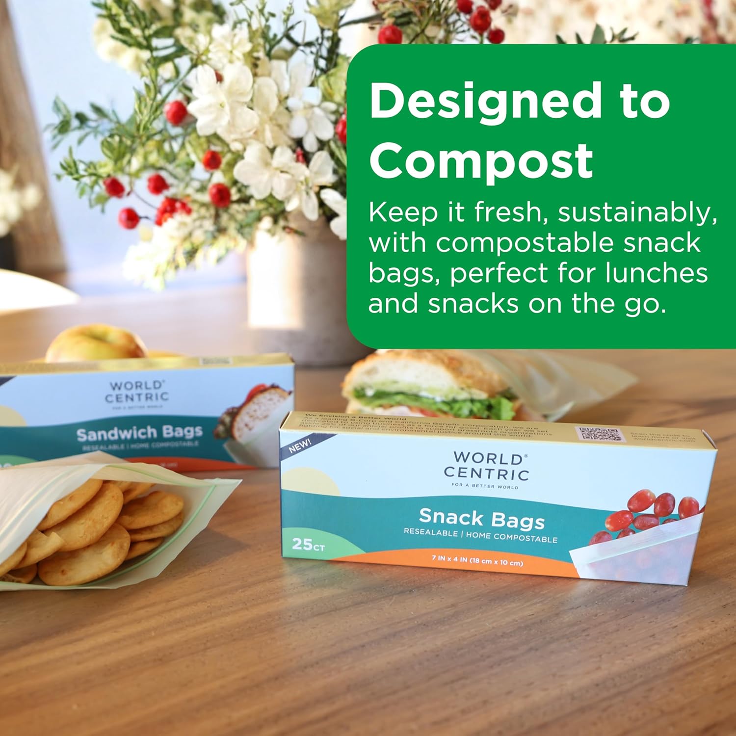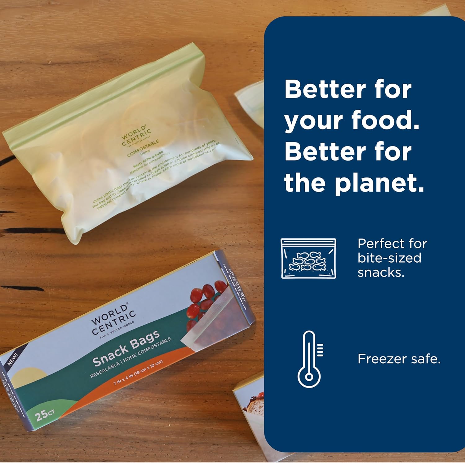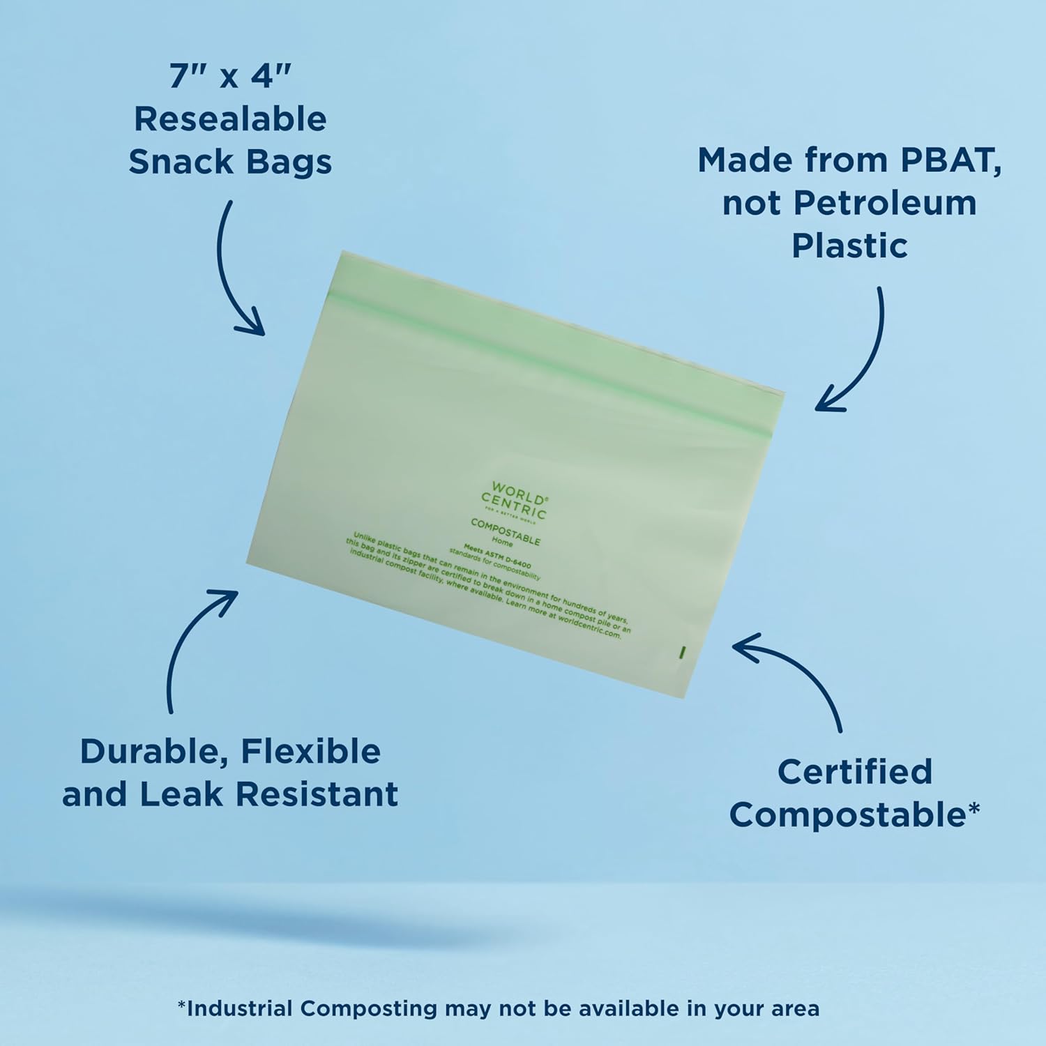 World Centric Compostable Resealable Snack Bags, 7″ x 4″ (Pack of 25), Made from Plants and Minerals, Sustainable, Heat Resistant, Perfect for Lunches & Snacks, PFAS Free