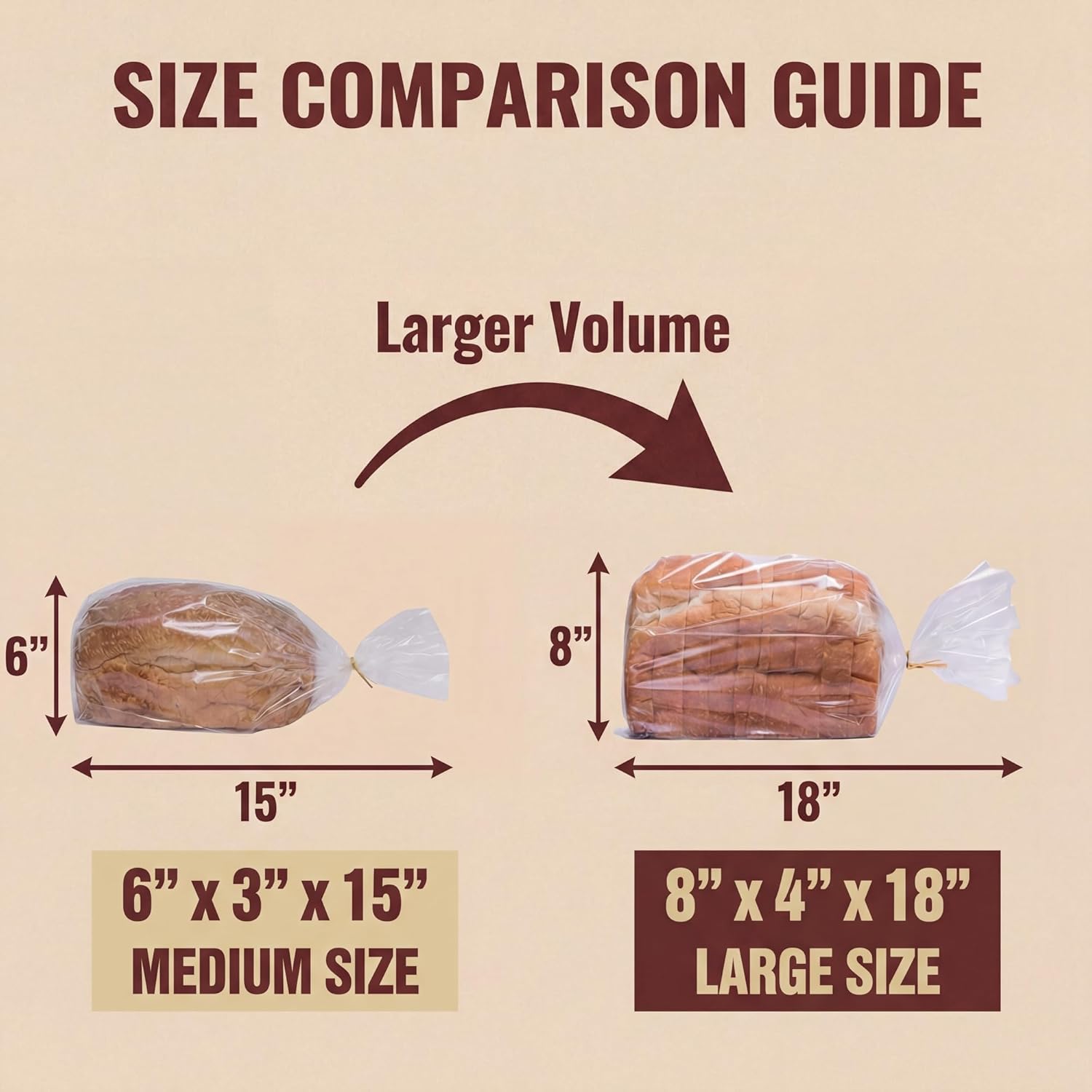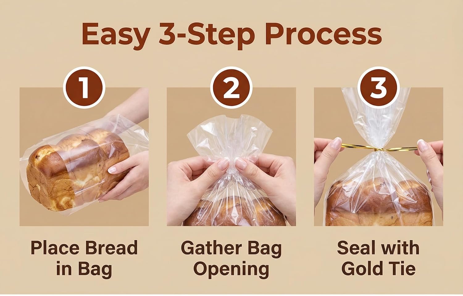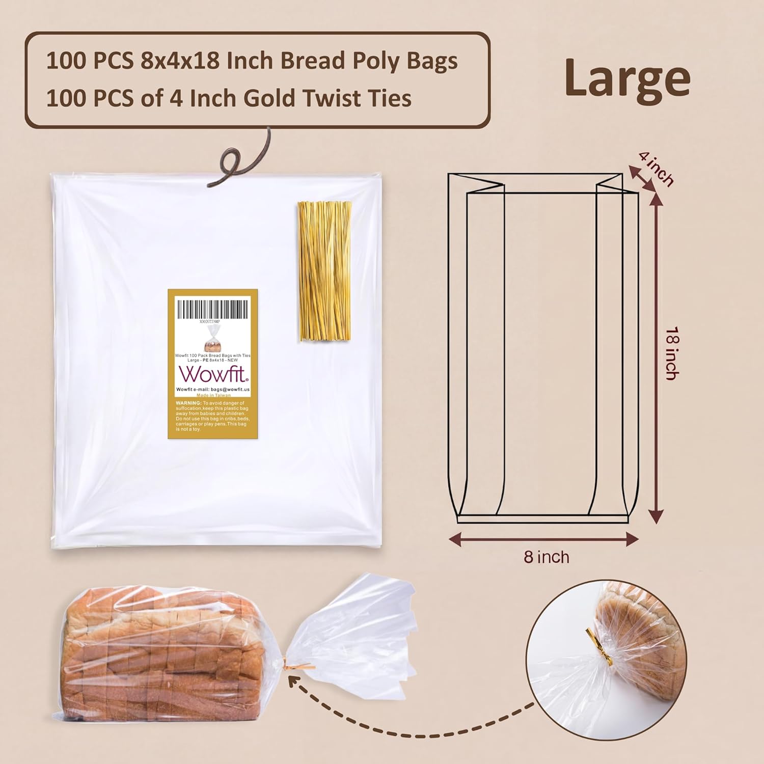 The prefect size with 100 bag ties: Each of our clear bakery bags measures 8 x 4 x 18 inches when fully extended, perfect for even large bread loaves; We’ve also included 100 gold color twist ties with our bread bags so you can fresh and pest free