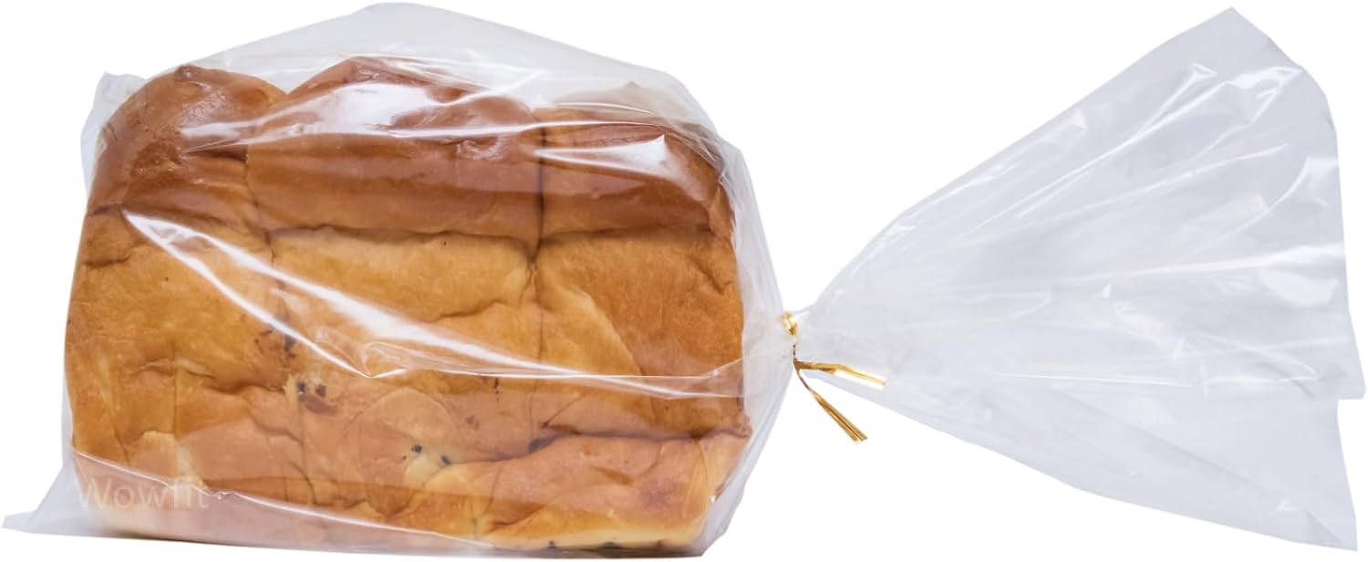 Wowfit Bread Poly Bags, Pack of 100 Entirely Transparent Clear Bakery Storage for Handmade Loaf Packaging, Includes 100 Gold Twist Ties