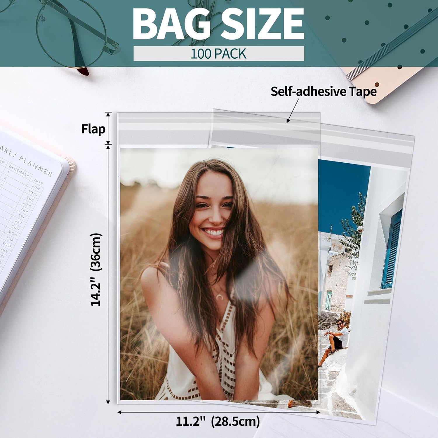 SPECIFICATION: Including 100 pieces 11 1/4″ x 14 3/16″ (28.5cm x 36cm) clear plastic bags with 1 3/16″ (3cm) flap. Each bag thickness is 1.6 Mil on one side.