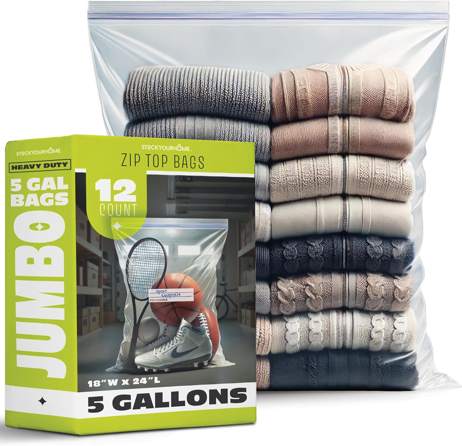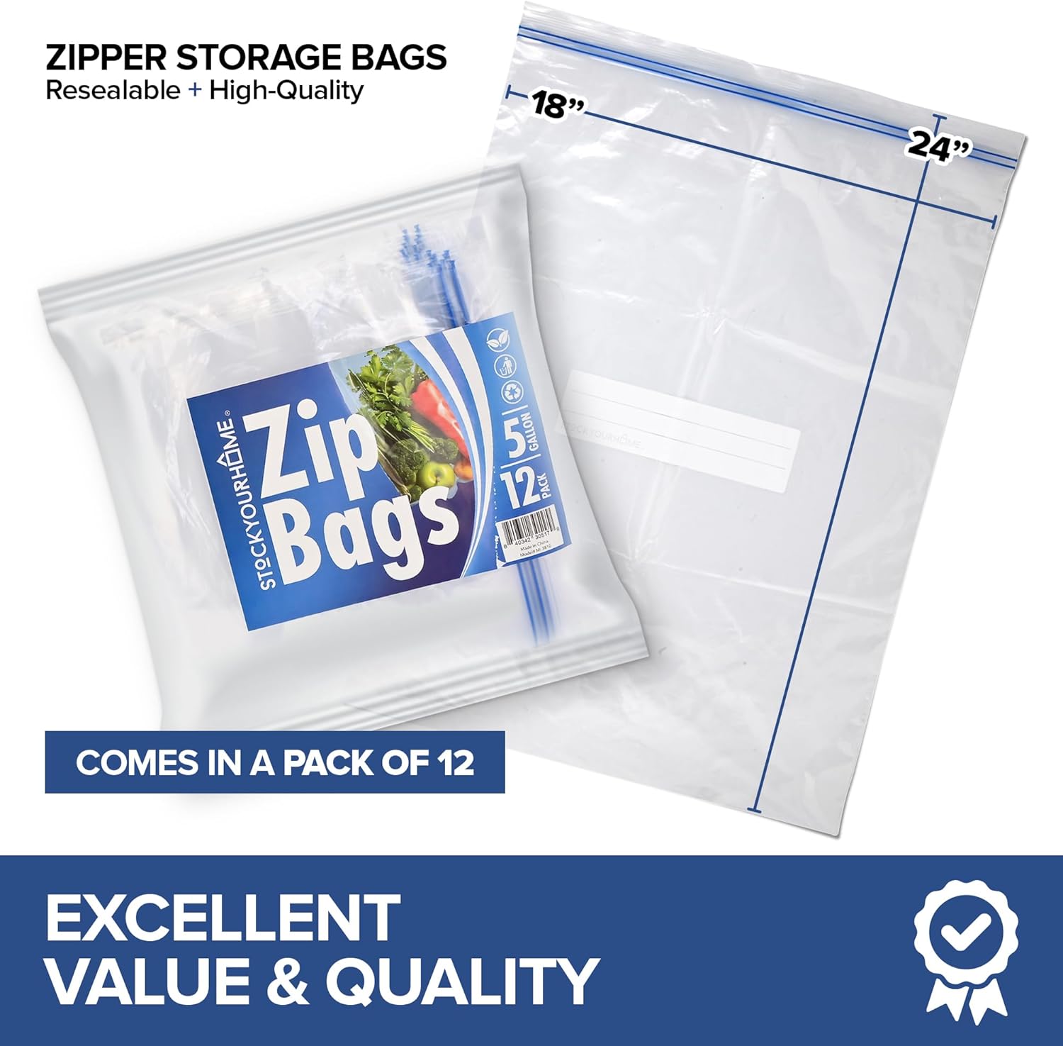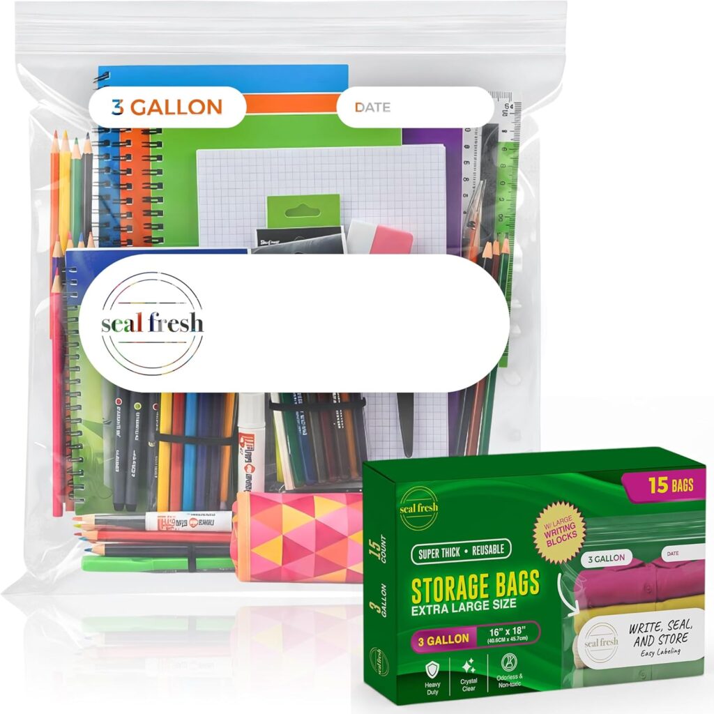 Zipper Storage Bags, (Pack of 12) 5 Gallon Resealable Food Storage Bag, Extra Large Zip Top Bags, Great Storage for Food, Clothing, Office Supplies & Travel Essential, 2 Mil Thick, Size 18″x 24″