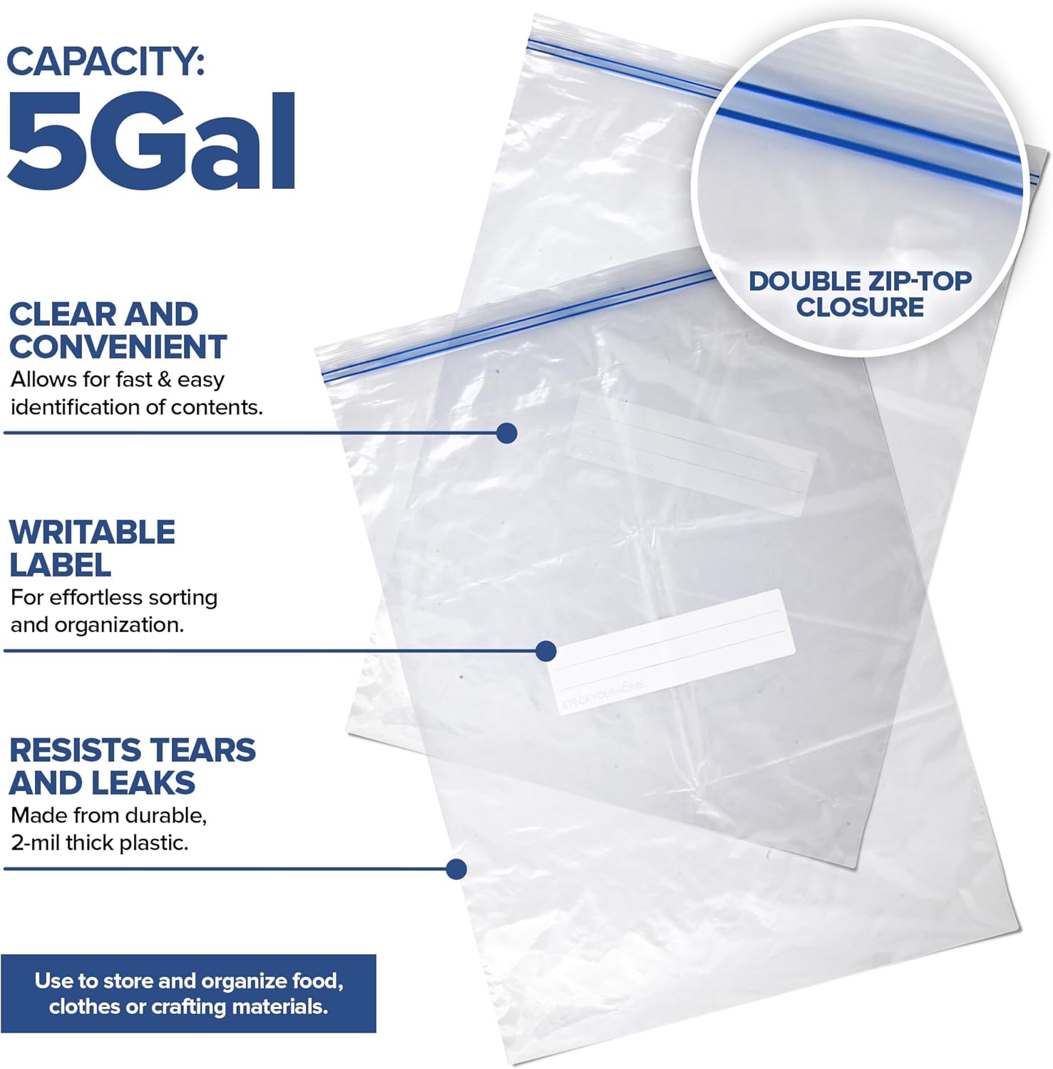 Clear and Convenient: The crystal-clear plastic of our 5 gallon plastic bags allows for easy identification of contents, saving you time searching for what you need. The zip-top closure opens and closes smoothly, making them easy to use for all ages