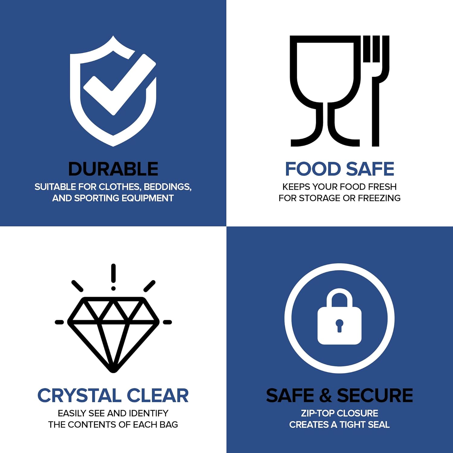 Safe and Secure: The convenient zip-top closure of our jumbo freezer bags creates a tight seal, keeping your food fresh and protecting your non-food items like hardware, cosmetics, and travel essentials.