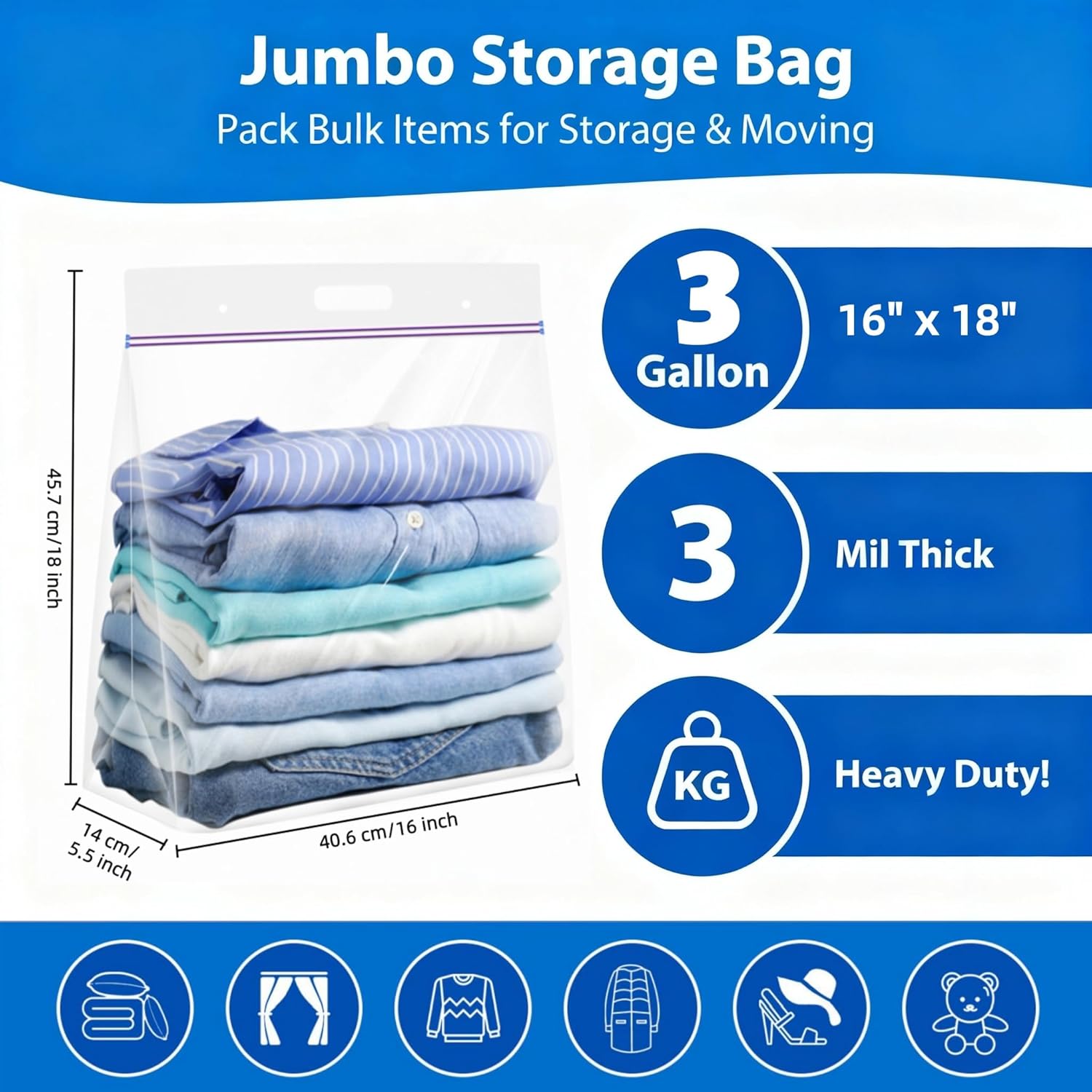 These jumbo zipper storage bags provide 3-gallon capacity, ideal for storing seasonal garments, comfoters, blankets, pillows, bedding, christmas decorations and more.